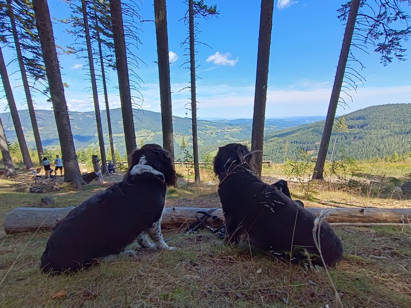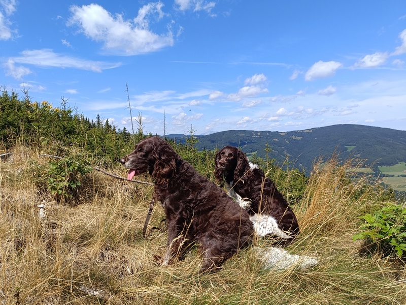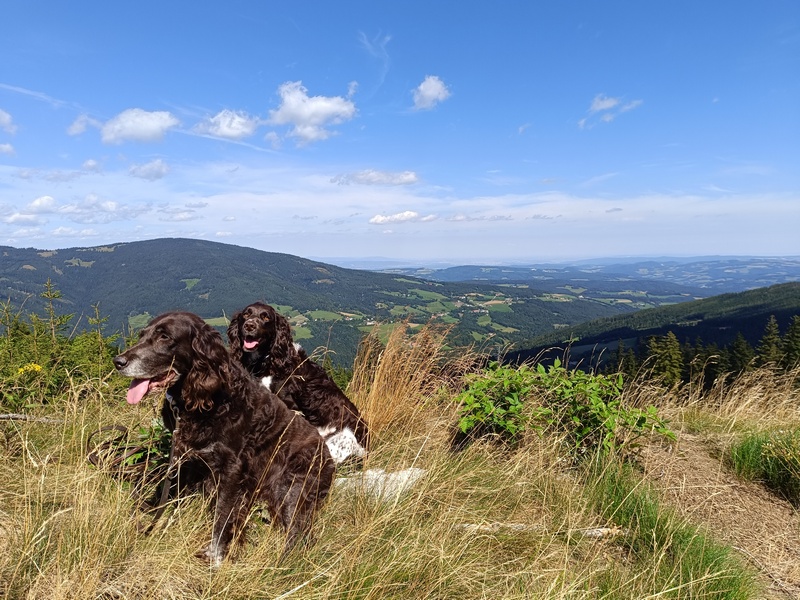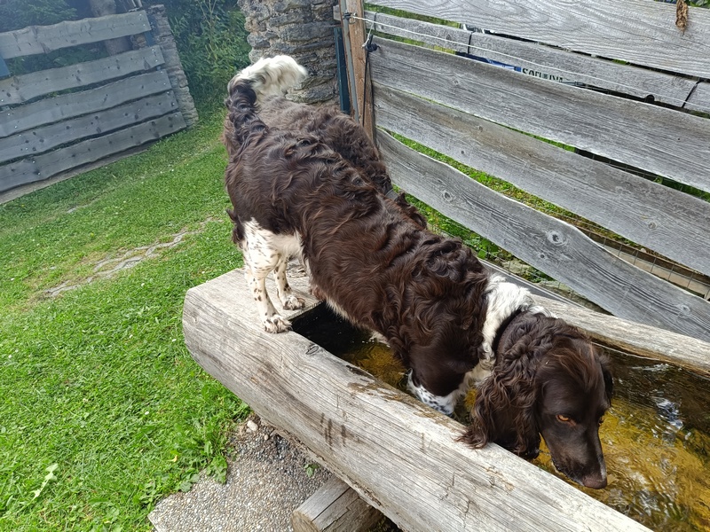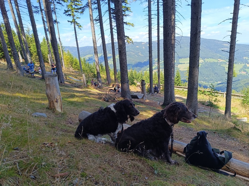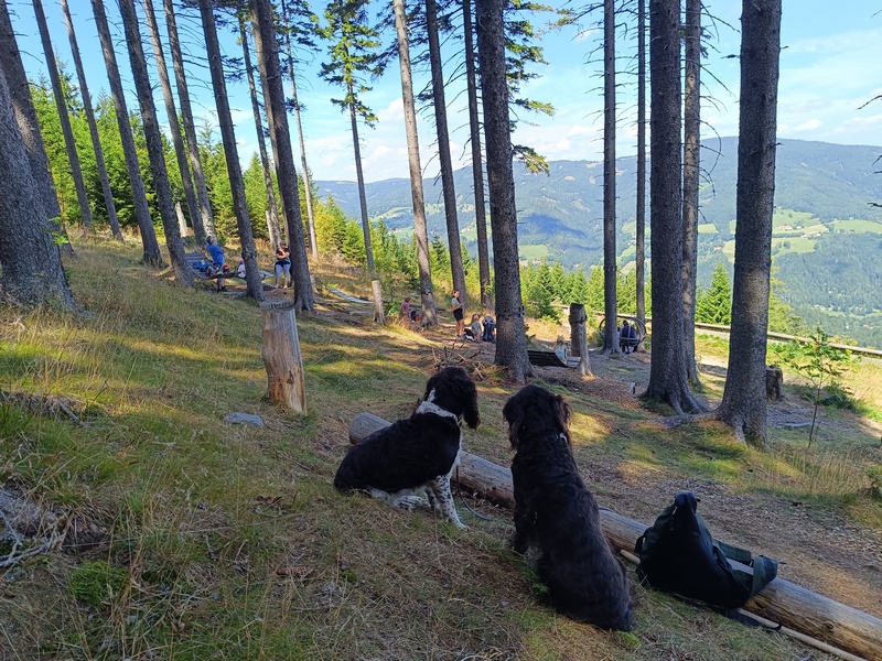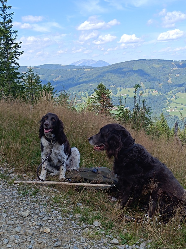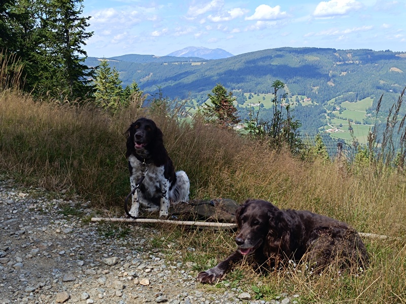Hier oben begegnen uns kaum noch Wanderer. Leider hat die Stoa Alm geschlossen, der Magen hängt in den Kniekehlen. Zum Glück habe ich noch was zum Trinken dabei und Wasser für die Hunde. Wir machen auf der Terrasse eine kurze Rast.